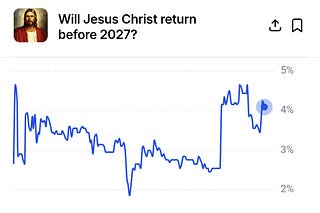 The price of a contract that pays a dollar if Jesus Christ returns this year is currently trading at about four cents on Polymarket, up from about two…