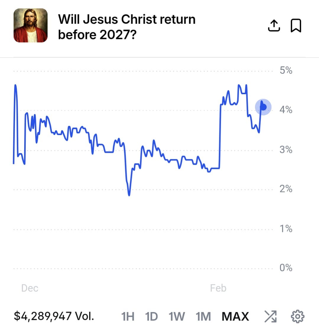 The price of a contract that pays a dollar if Jesus Christ returns this year is currently trading at about four cents on Polymarket, up from about two cents in early January:
