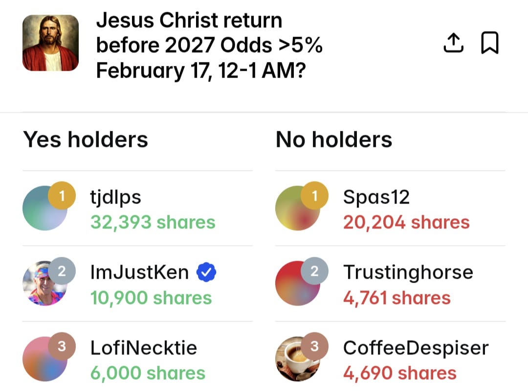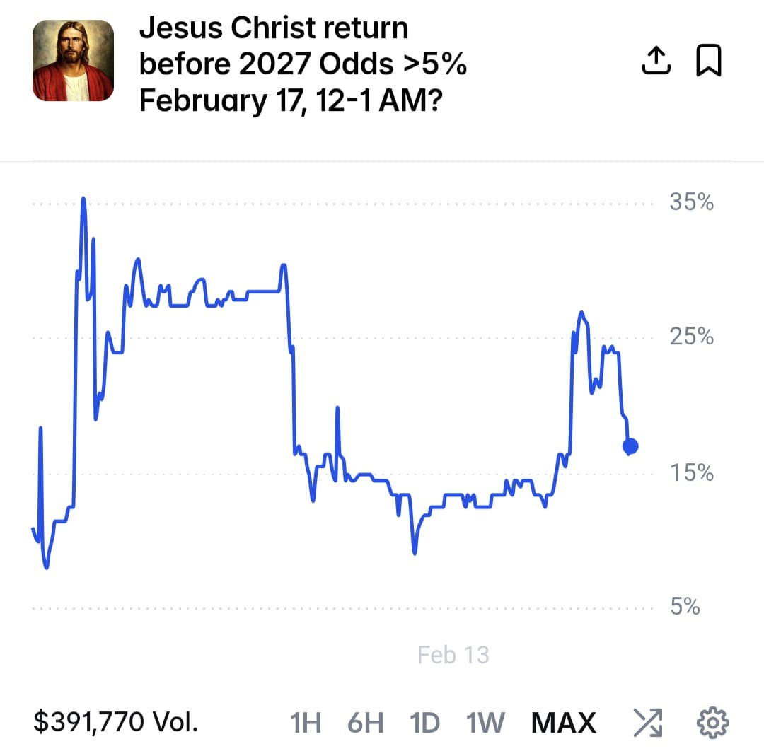 Love the resolution rule on The second Coming: "The resolution source for this market will be a consensus of credible sources."